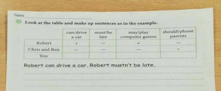 Robert may play computer games. Robert shouldn't phone parents. Cris and Ben can't drive a car. Cris and Ben mustn't be late. Cris and Ben may not play combuter games. Cris and Ben should phone parents.