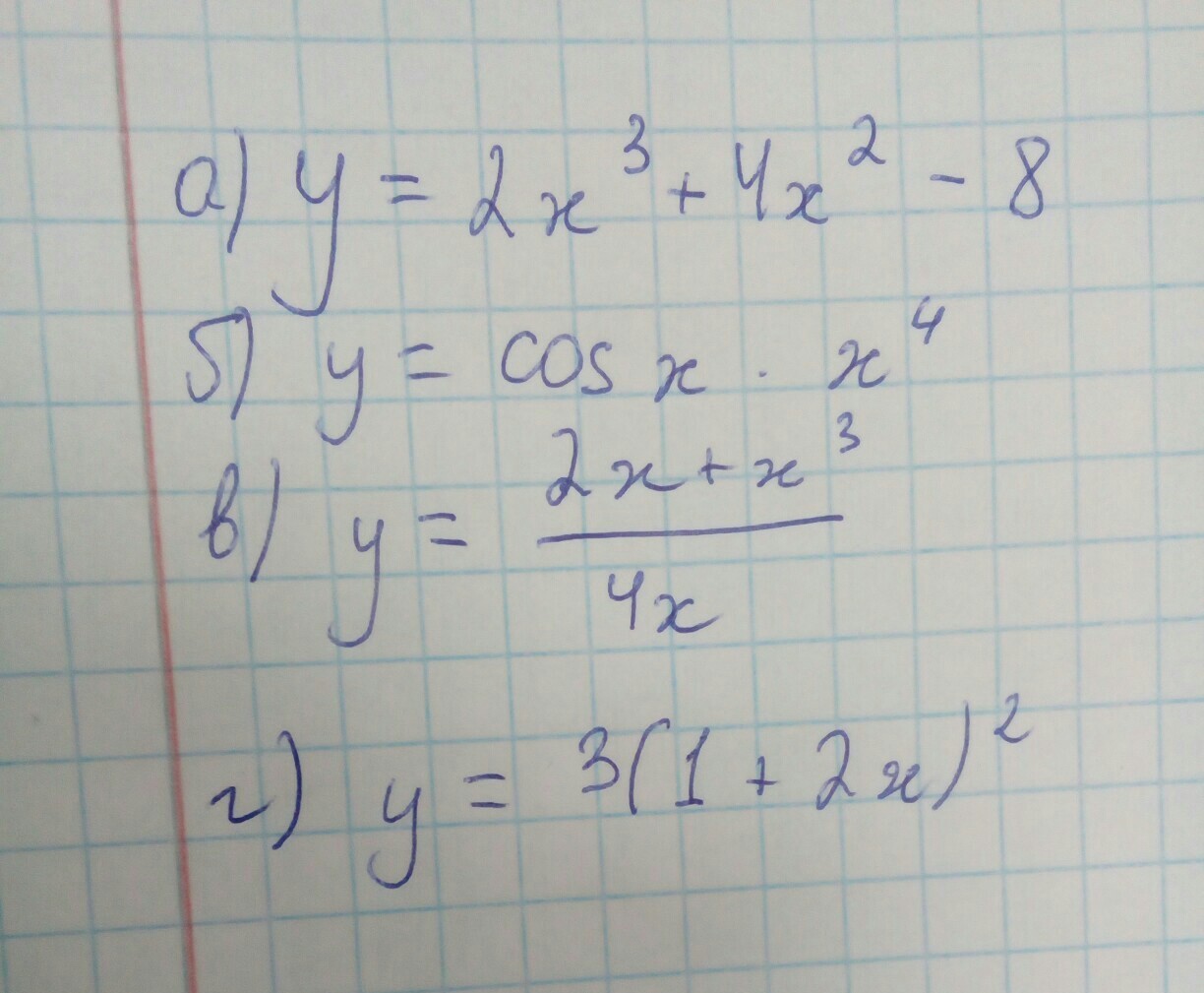 c)y=((2x+x^3)'*4x-(4x)'*(2x+x^3))/(4x)^2= ((2+3x^2)*4x - 4*(2x+x^3))/16x^2=(8x+12x^3-8x+4x^3)/16x^2=16x^3/16x^2=x