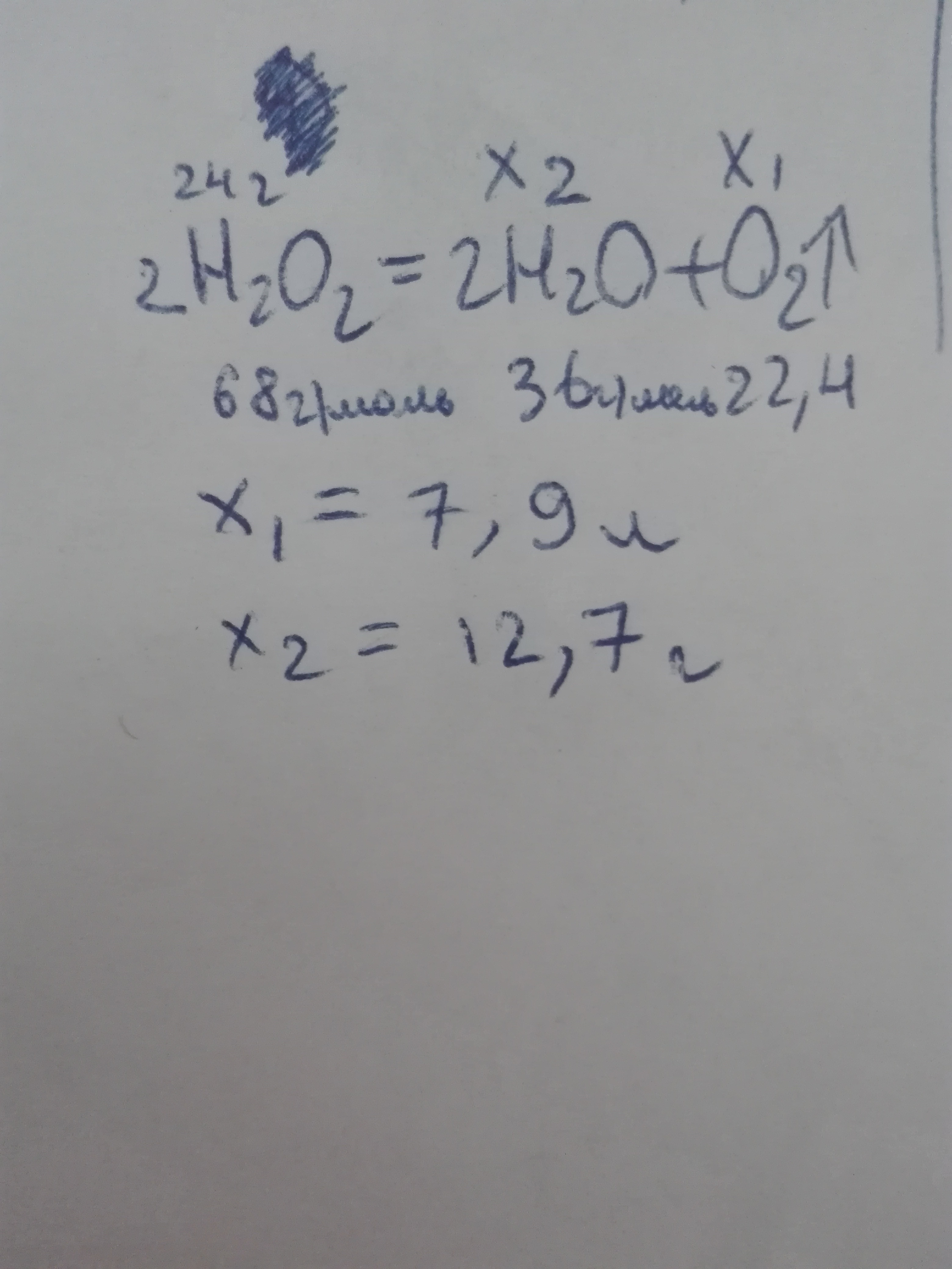 Объем выделившегося газа (кислорода) равен 7,9 л. Масса воды равна 12,7 г