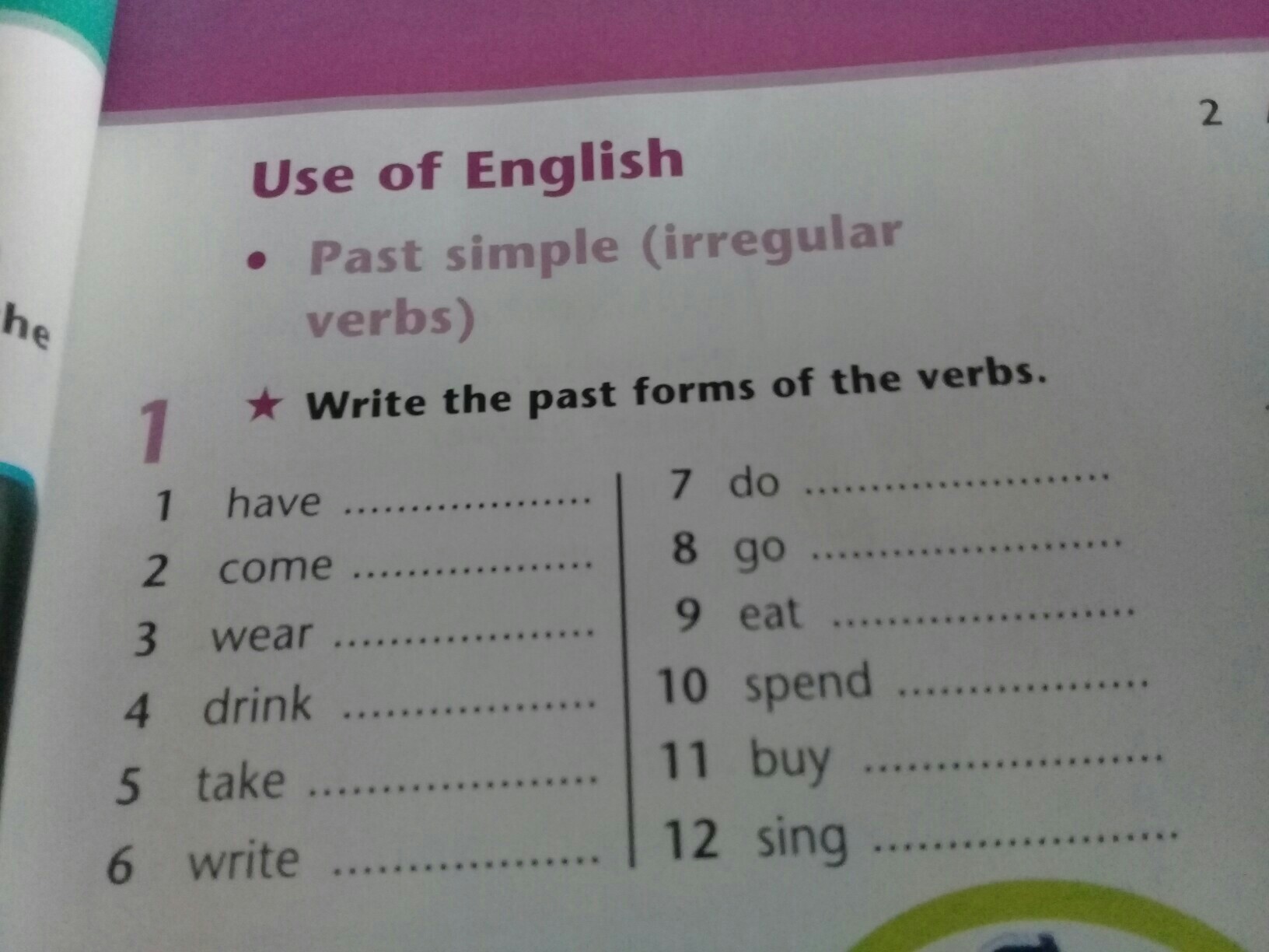1.had 2.came 3.wore 4.drank 5. took 6.wrote 7.did 8.went 9.ate 10.spent 11.bought 12.sang