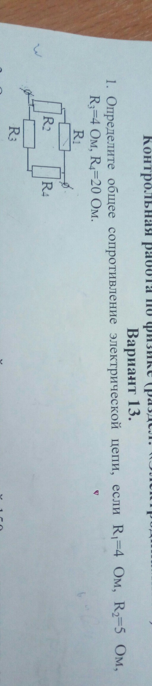 определите общее сопротивление электрической цепи, если r1 =4, r2=5, r3=4, r4=20 ом.