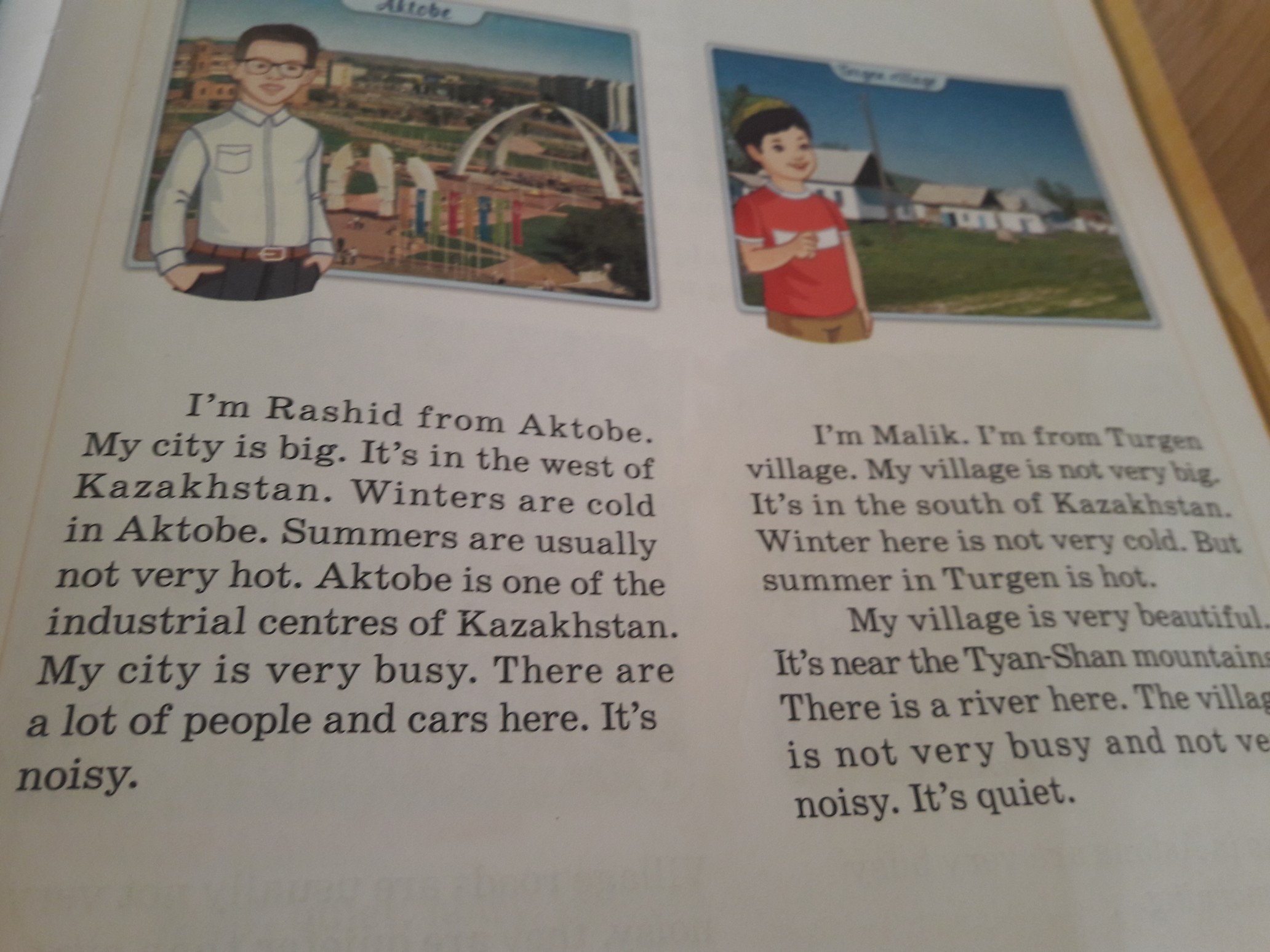 I'm Rashid from Aktobe. My city is big. It's in the west of Kazakhstan. Winters are cold in Aktobe. Summers are usually not very hot. Aktobe is one of the industrial centres of Kazakhstan. My city is very busy. There are a lot of people and cars here. It's noisy.