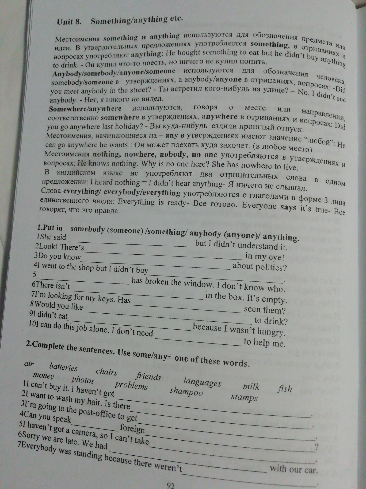 1 any money 2 any shampoo 3 some stamps 4 any foreign languages 5 any photos 6 some problems 7 any chairs