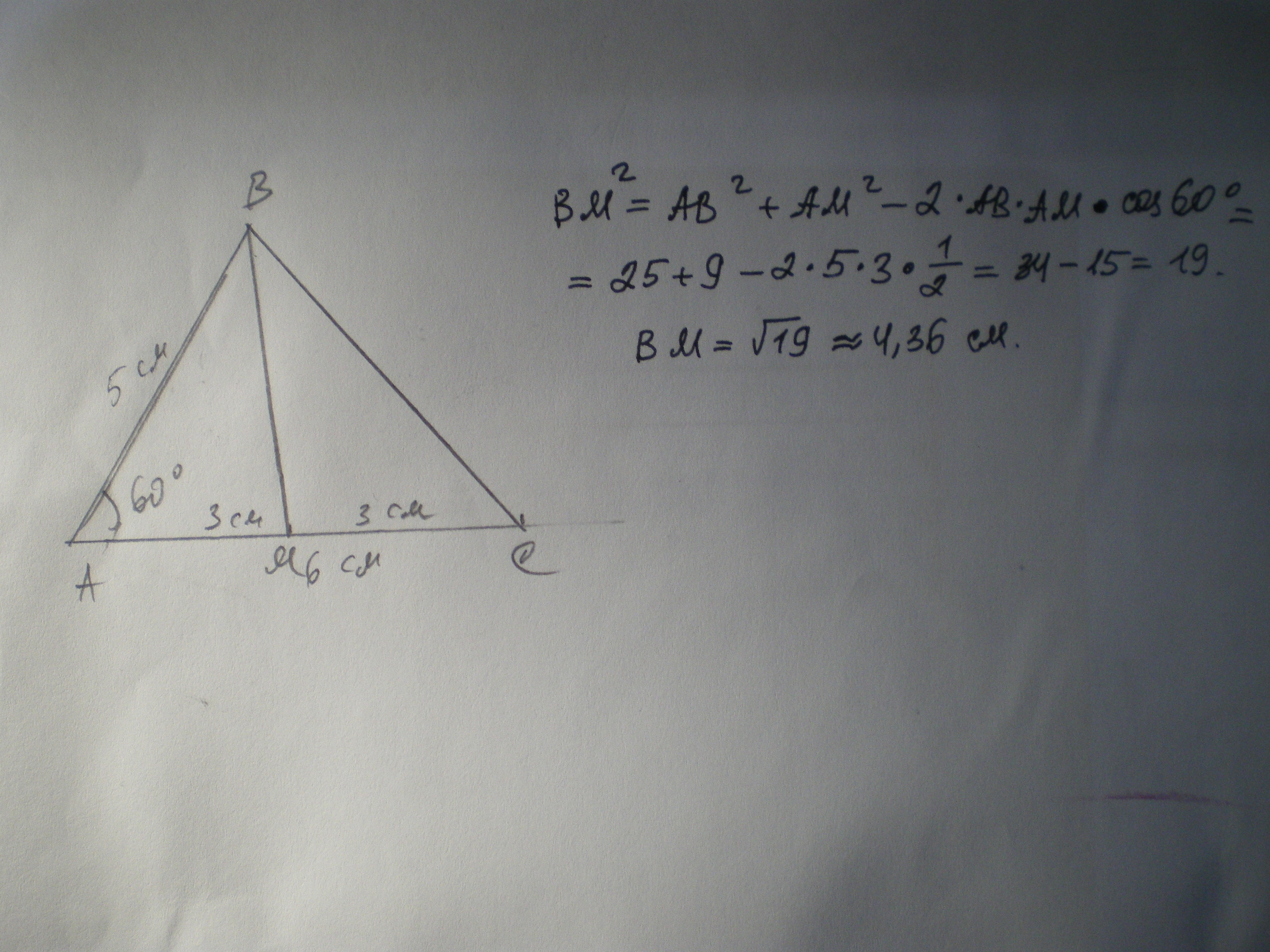 Дано: ΔАВС, АВ=5 см, ВС=6 см, ∠А=60°, ВМ - медіана.
