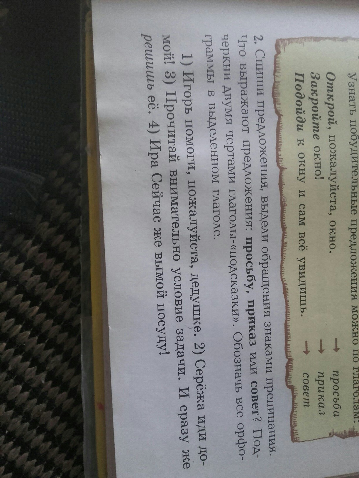 1) Игорь, помоги, пожалуйста, дедушке. (Просьба) 2) Серёжа, иди домой! (Приказ) 3) Прочитай внисательно условие задачи. И сразу же рЕшишЬ* её. (Совет) 4) Ира, сейчас же вымой посуду! (Приказ)