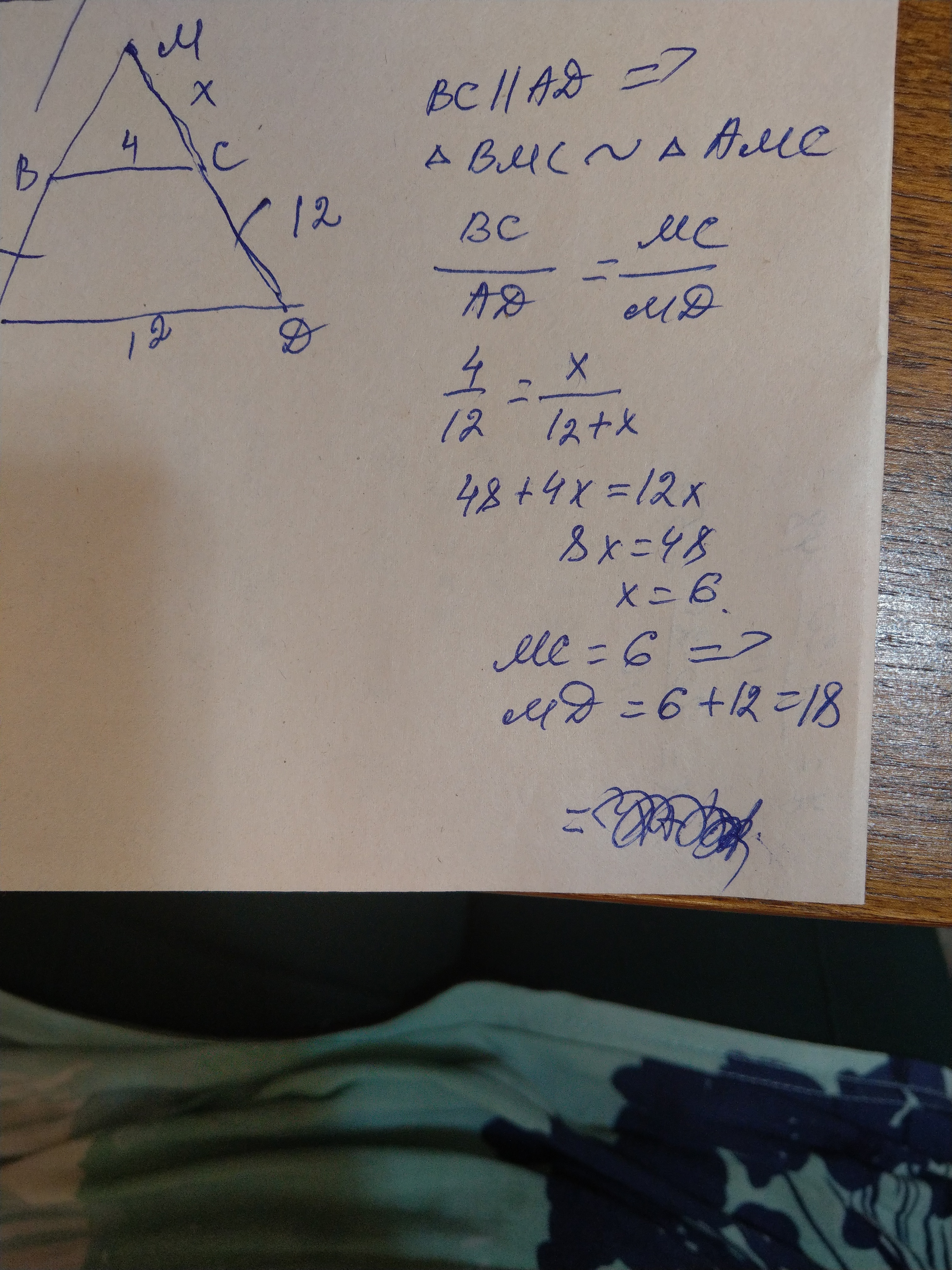 Боковые стороны равнобедренной трапеции продолжены до пересечения в точке M . Основания трапеции равны 4 см и 12 см, боковая сторона равна 12 см. Найти расстояние от точки M до конца большего основания.