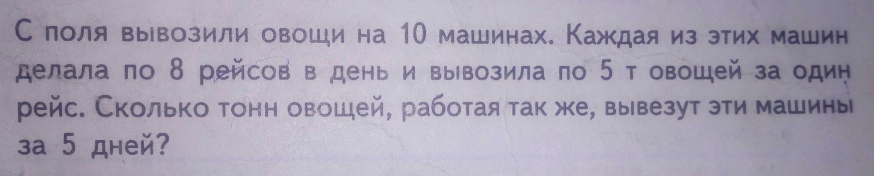С поля вывозили овощи на 10 машинах. Каждая из этих машин делала по 8 рейсов в день и вывозила по 5 т овощей за один рейс.Сколько тонн овощей, работая так же, вывезут эти машины за 5 дней?