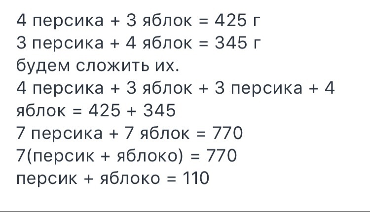 Масса 4-х персиков и одного яблока 0,79 кг, а 1-ого персика та 5-ти яблок 1,385 кг. Какая масса 1-ого персика и 1-ого яблока отдельно? Даю 15 баллов