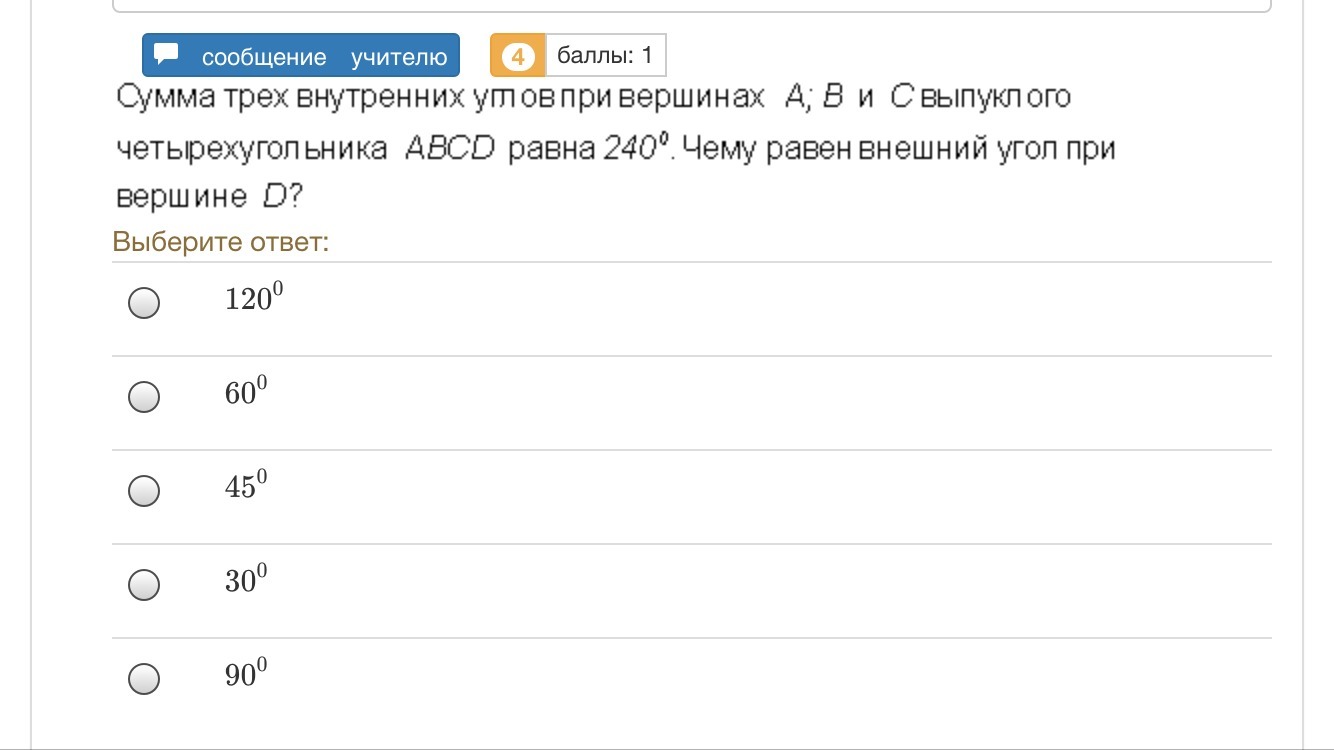 Сумма внутренних углов четырехугольника равна 360 градусов, значит при условии, что сумма углов А, В, С равна 240 градусов: