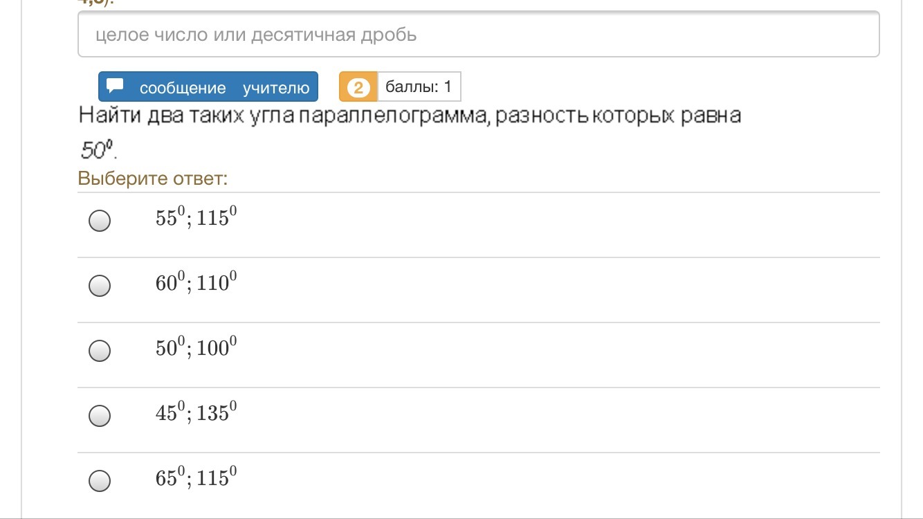сумма углов паралллограмма, прилегающих к одной стороне равна 180°, значит градусными мерами углов, разность которых равна 50° могут быть углы: