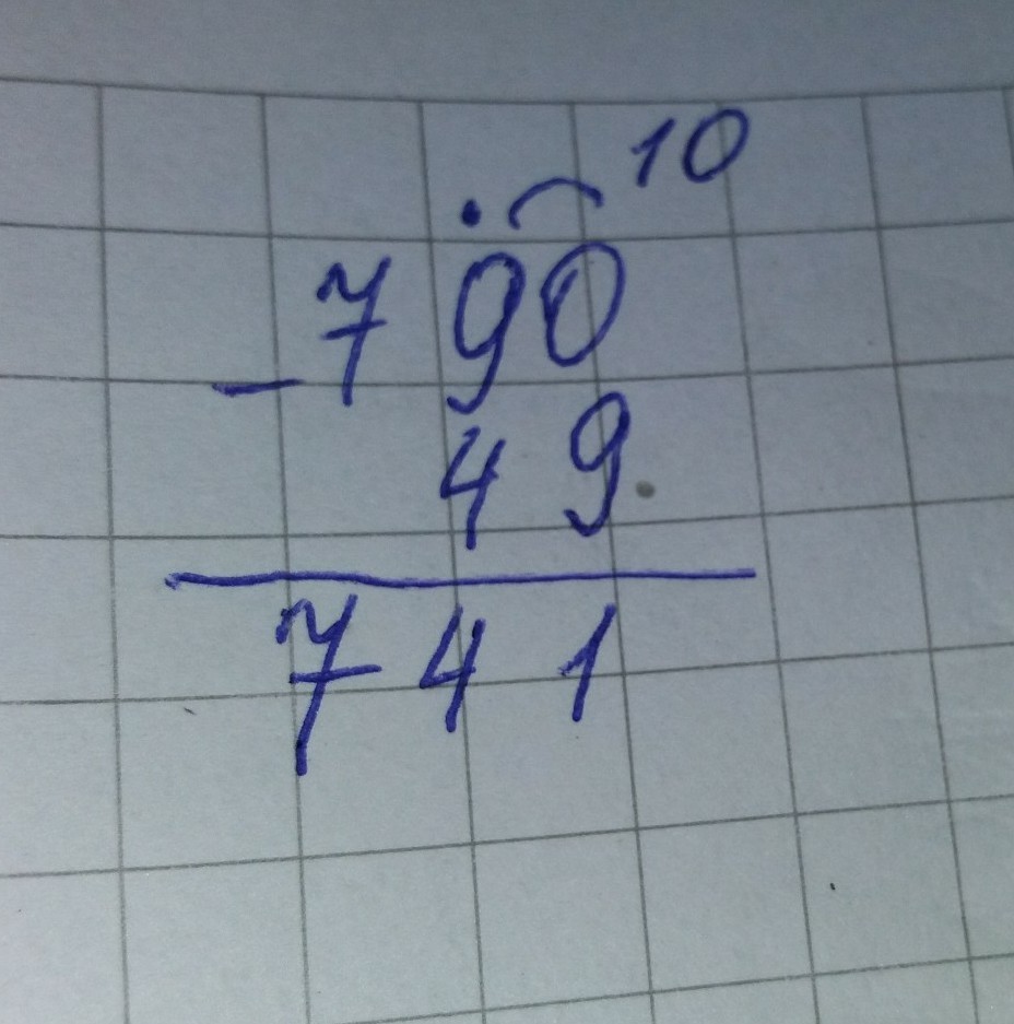 Из нуля мы девять вычесть не можем,поэтому занимаем десяток у впереди стоящей цифры (соответственно, там остается уже не 9,а 8),и производим вычитание