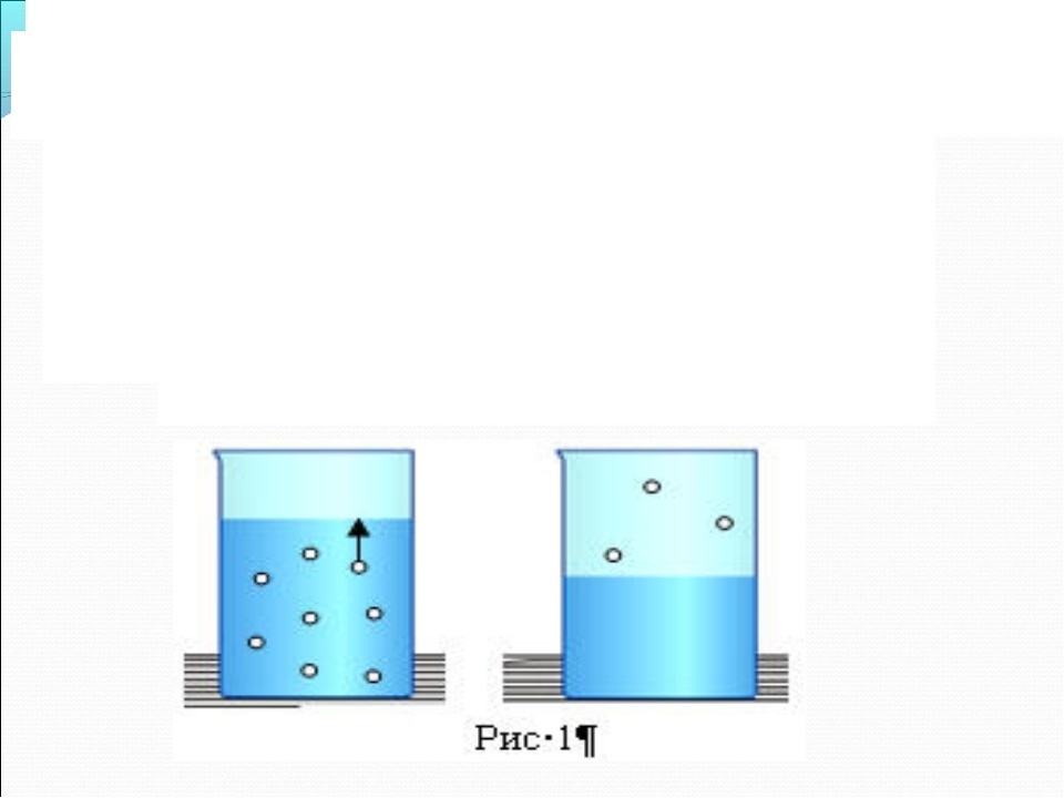 Если оставить стакан, наполненный водой, в комнате (или на улице, или даже в холодильнике), то в течение нескольких дней можно наблюдать, как уровень в стакане постепенно понижается. Это объясняется испарением воды из стакана: молекулы (мельчайшие частицы) воды отрываются от её поверхности и переходят в водяной пар (см. рисунок).