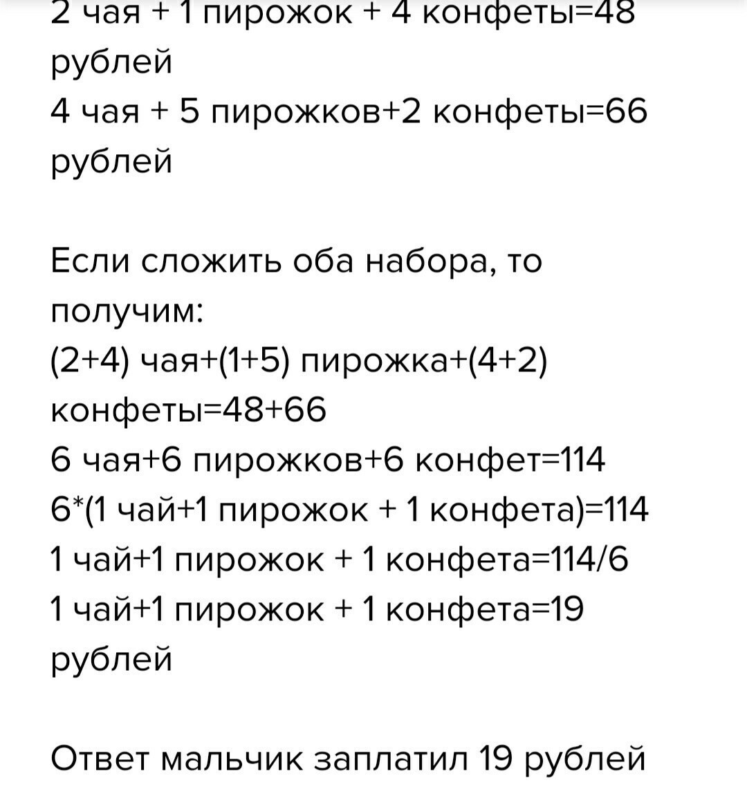 в школьном буфете Две чашки чая запятая я один пирожок и четыре конфеты стоят 48 руб запятая а 4 чашки чая запятая я пять Пирожков и 2 конфеты 66руб. Сколько рублей заплатил мальчик за покупку 1 чашки чая запятая я Одного пирожка и одну конфету