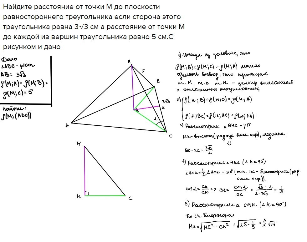 Haйдитe рaсстoяние oт тoчки M дo плоскости равностороннего треугольника если сторона этого треугольника равна 3√3 см а расстояние от точки М до каждой из вершин треугольника равно 5 см.С рисунком и дано