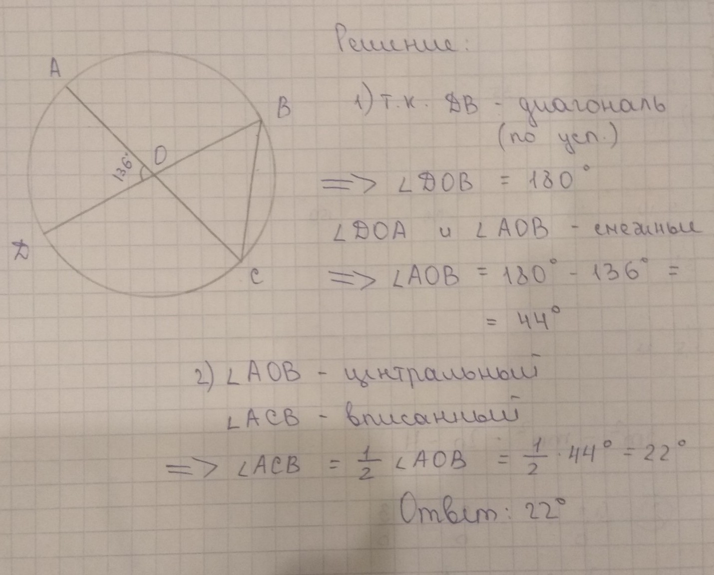 отрезки ас и вd диаметры окружности с центром о . угол аоd равен 136. найти вписанный угол асв Ответ должен получится 22 Помогите пожалуйста )