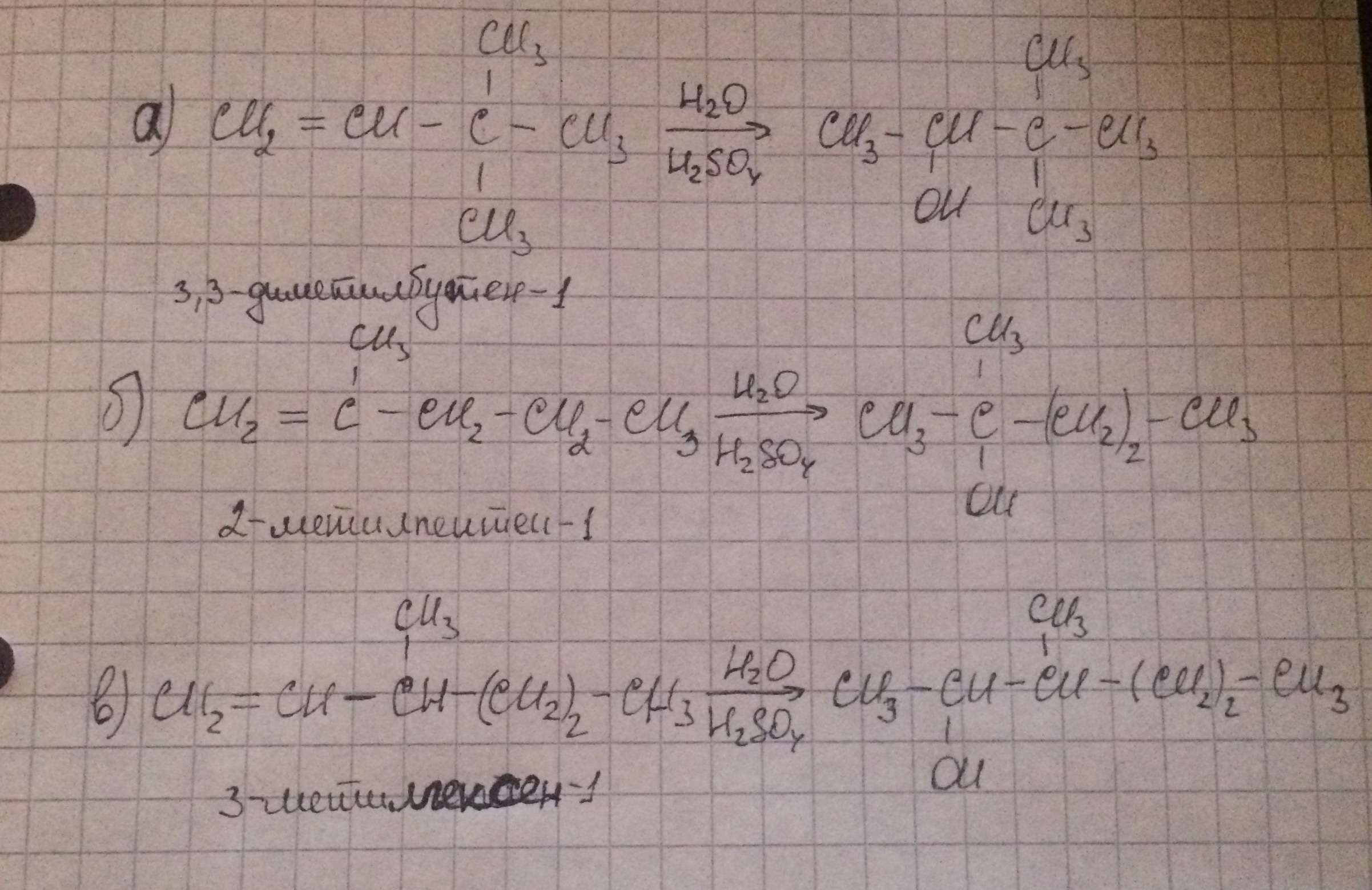1)CH2=CH-CH(CH3)-CH3+H2O->CH3-CHOH-CH(CH3)-CH3