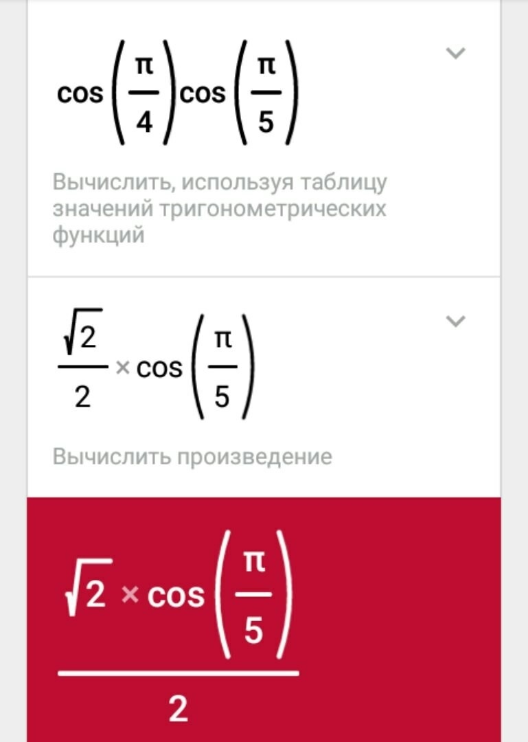 ==1/2(cos(π/4-π/5)+cos(π/4+π/5)=1/2(cosπ/20+cos9π/20).