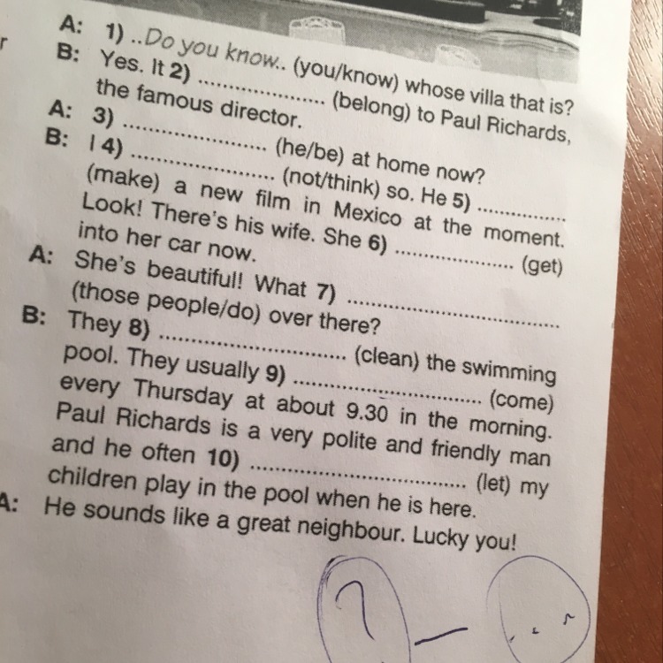 B: They 8) are cleaning the swimming. Paul Richards is a very polite and friendly man and he often 10) lets my children play in the pool when he is here.