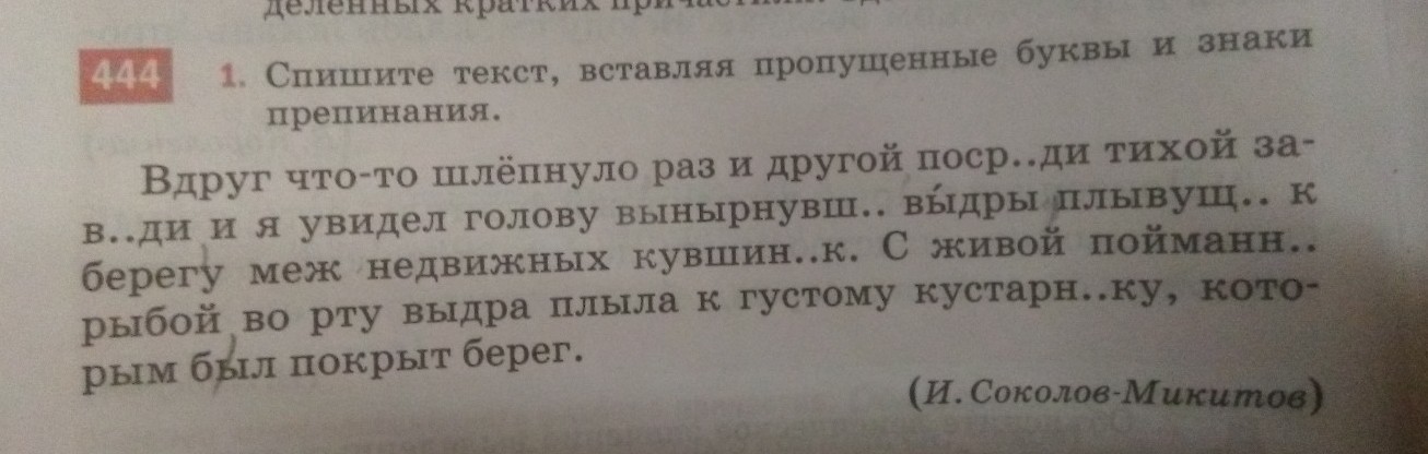 Вдруг что-то шлепнуло раз и другой посреди тихой заводи, и я увидел голову вынырнувшей выдры, плывущей к берегу меж недвижных кувшинок . С живой пойманной рыбой во рту выдра плыла к густому кустарнику, которым был покрыт берег.