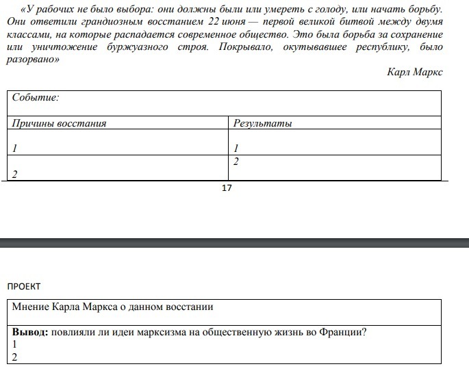 Здесь идет речь об июньском (22 июня) восстании 1848 года, которое произошло в Париже после принятия Комиссией исполнительной власти решения высылать из города в провинцию всех рабочих, которые трудились в национальных мастерских. Таковых в Париже на момент восстания было не меньше 100 тысяч человек, многие из них приехали в столицу для спасения своих семей, находившихся в разных концах страны и едва сводивших концы с концами от голода, вызванного неурожаем картофеля в 1845-46гг. Многие из этих людей были вооружены и настроены весьма решительно, а потому буржуазия и аристократия серьезно опасались их. Действия правительства по роспуску мастерских вызвали массовые протесты и демонстрации, которые были жестоко подавлены войсками, стянутыми в Париж из разных частей страны. Карл Маркс писал об июньском восстании, что это было однозначно поражением революции; однако погибала не революция, а погибали дореволюционные общественные отношения и устои, от которых революционная партия не освободилась в результате февральской революции 1848 года, и только ряд поражений, включая июньское восстание 1848 года, могли освободить ее от иллюзий и укрепить ее, сделав по-настоящему революционной.