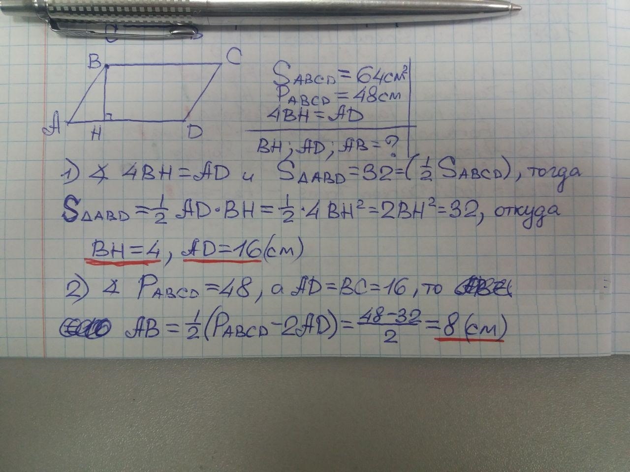 Площадь параллелограмма равна 64см2, а его периметр равен 48 см. Высота, проведённая к одной из его сторон, в 4 раза меньше, чем эта сторона. Вычисли: 1) данную высоту; 2) сторону, к которой она проведена; 3) вторую сторону параллелограмма.