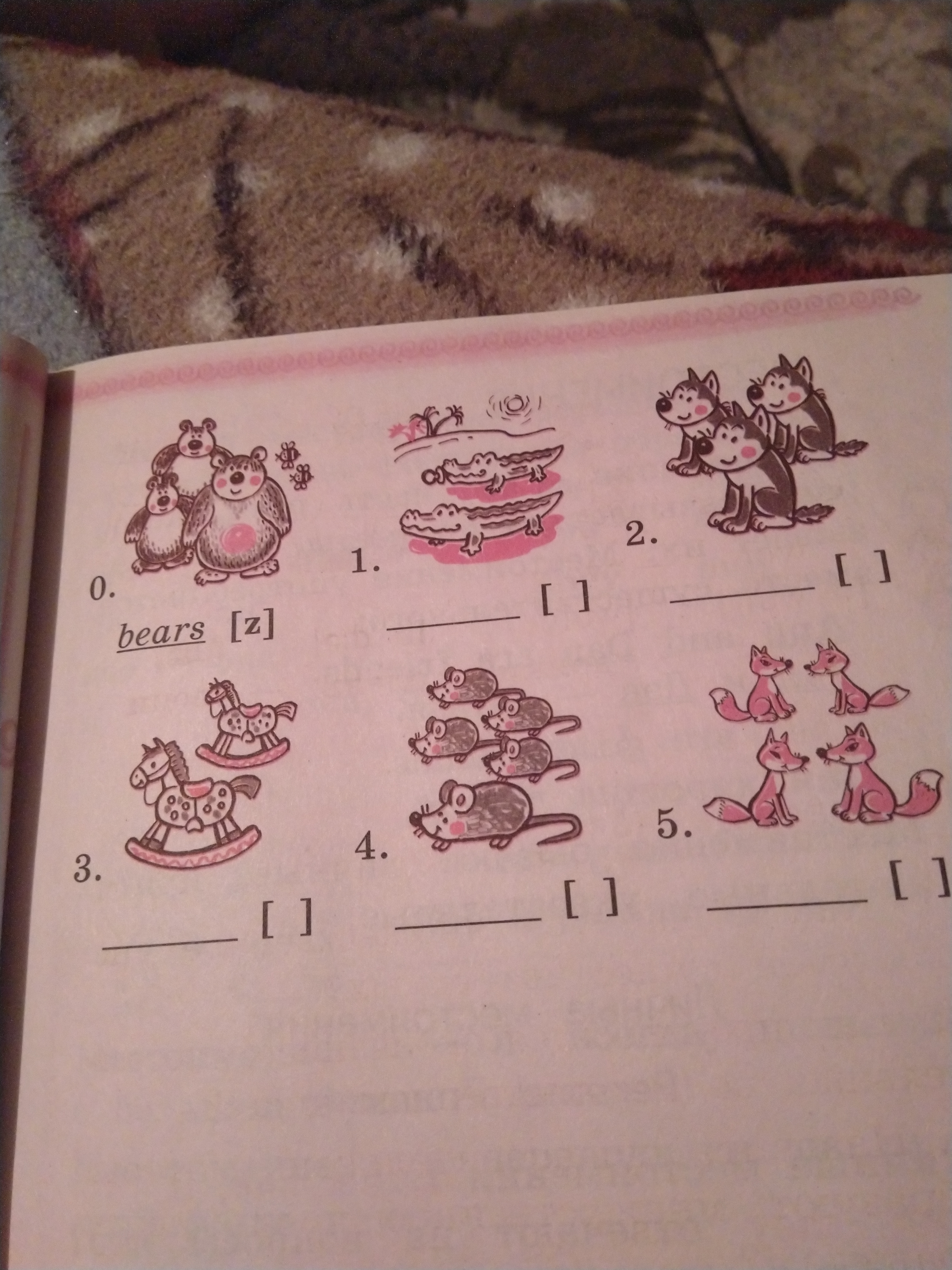1. crocodiles [z], 2. wolfes [слово исключение], 3. horses [iz], 4. mouses (на самом деле во множ.ч. мыши переводятся как mice тоже слово исключение), 5. foxes [iz],