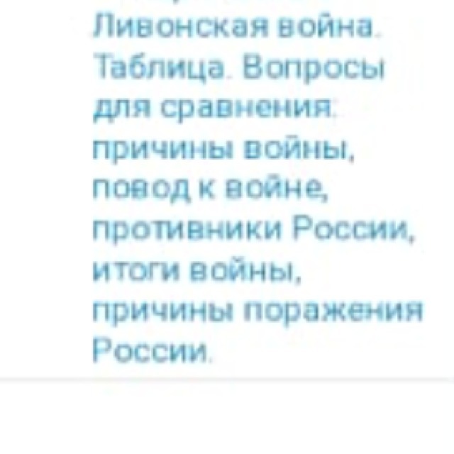 ливонская война 1558-1583г.г возникла на западе, царь магистр снял себя с должности и в 1563 г заключил перемирие, но это была ловушка в 1569 г.г мы терпим поражения в г.люблено была подписана уния (династический союз) Литва+Польша =Речьпоспалитая это объединение стран дало одну большую страну + шведы 1572 г в итоге мы воюем с Литвой Польшей и шведами не хило так, они сожгли Москву , уничтожили Псков, полоцск, и ещё три города Иван заключил мир у России нет союзников, 1582 гг был подписан мир ян-запольский мы потеряли по нему топорье, ян, Иван город, крепость нерва, 1583 гг плюсский мир потеряли северную калерию, потеряли финский залив.
