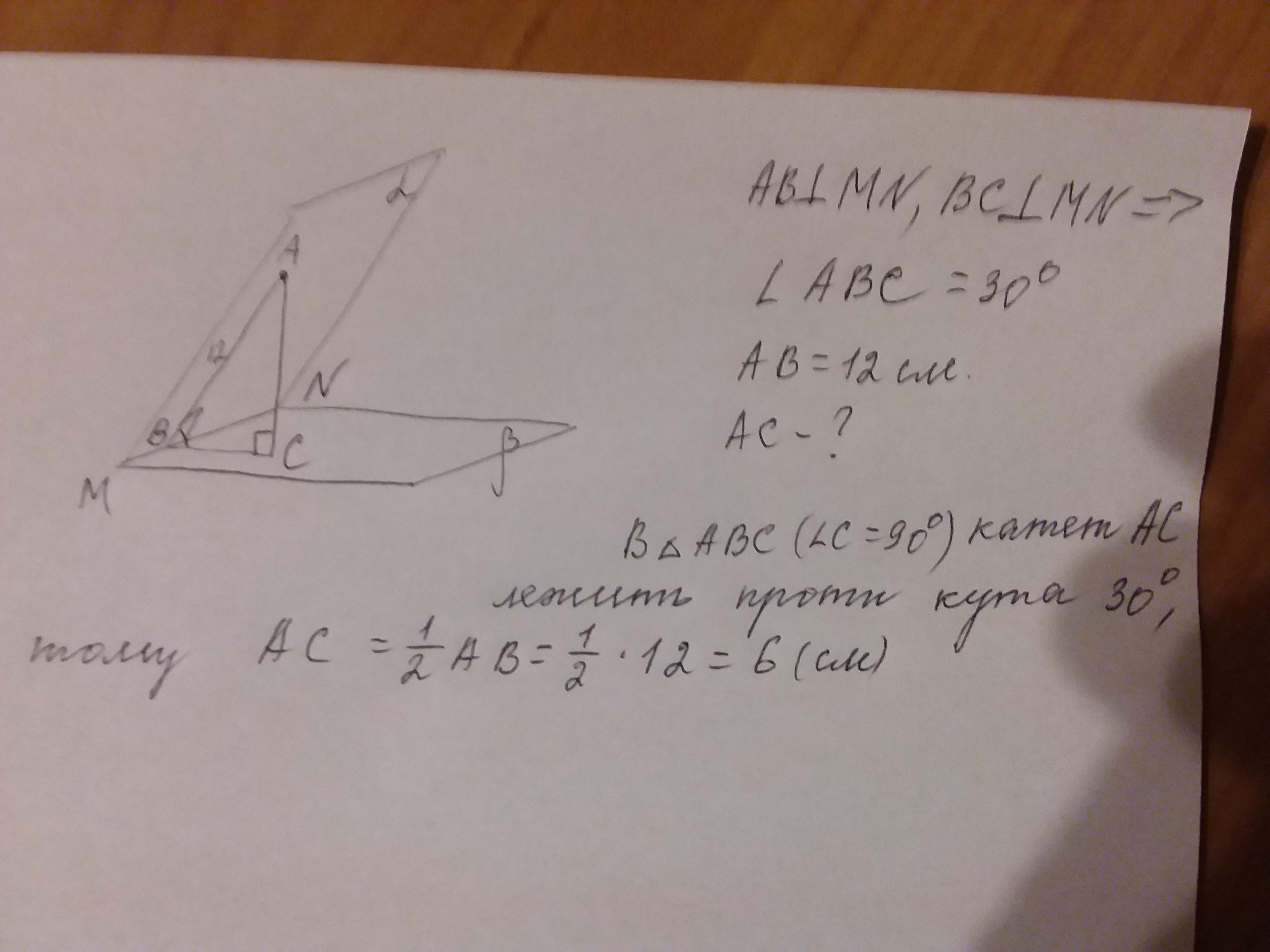 Кут між площинами Альфа і бета дорівнює 30 градусів точка А яка лежить у площині Альфа віддалена від лінії перетину площин на 12 см Знайдіть відстань від точки А до площини бета