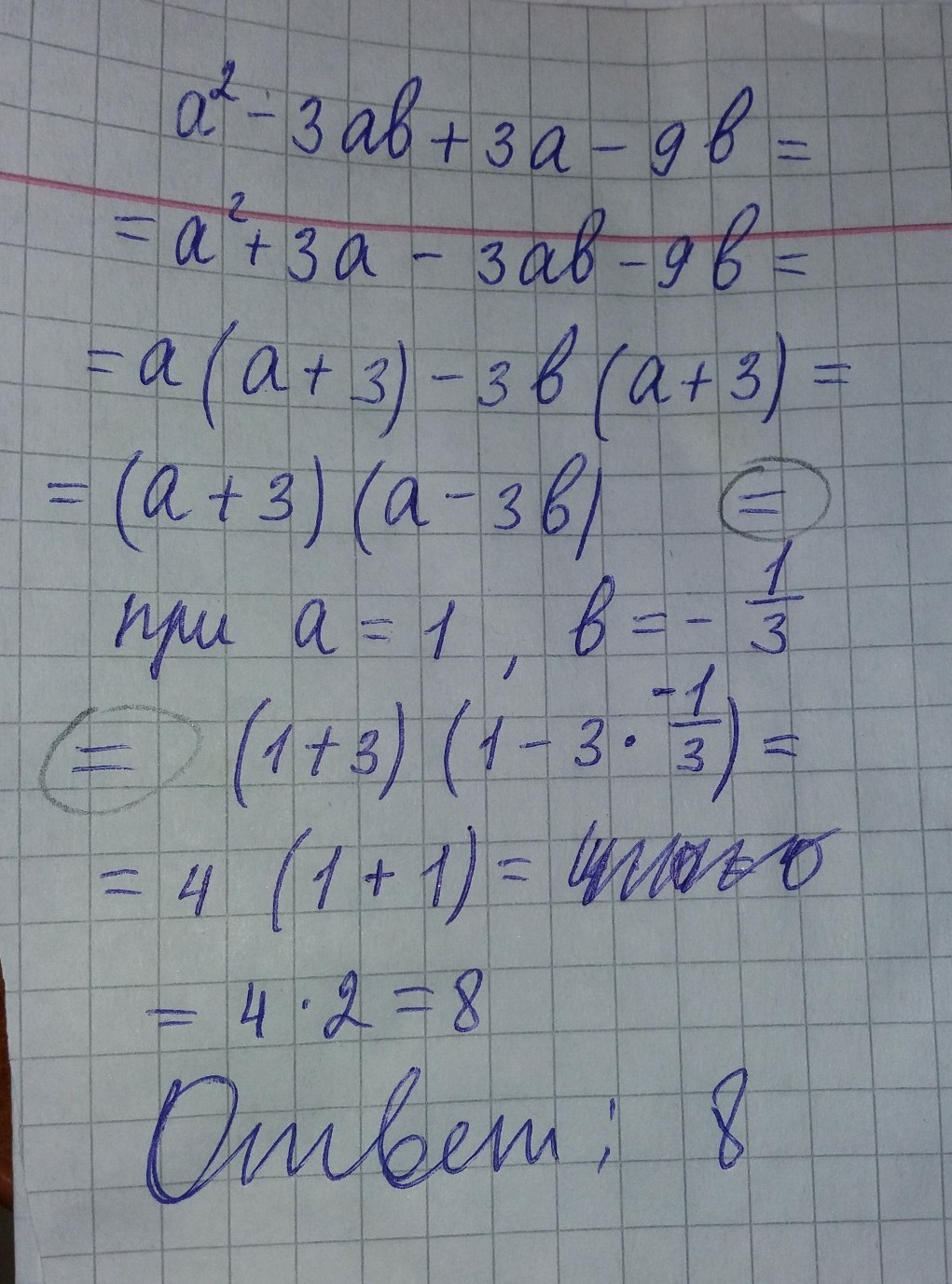 Ребята срочно !Разложить на множители многочлен a(в квадрате) -3ab + 3a-9b и найти его числовое значение при a=1 , b =- 1/3