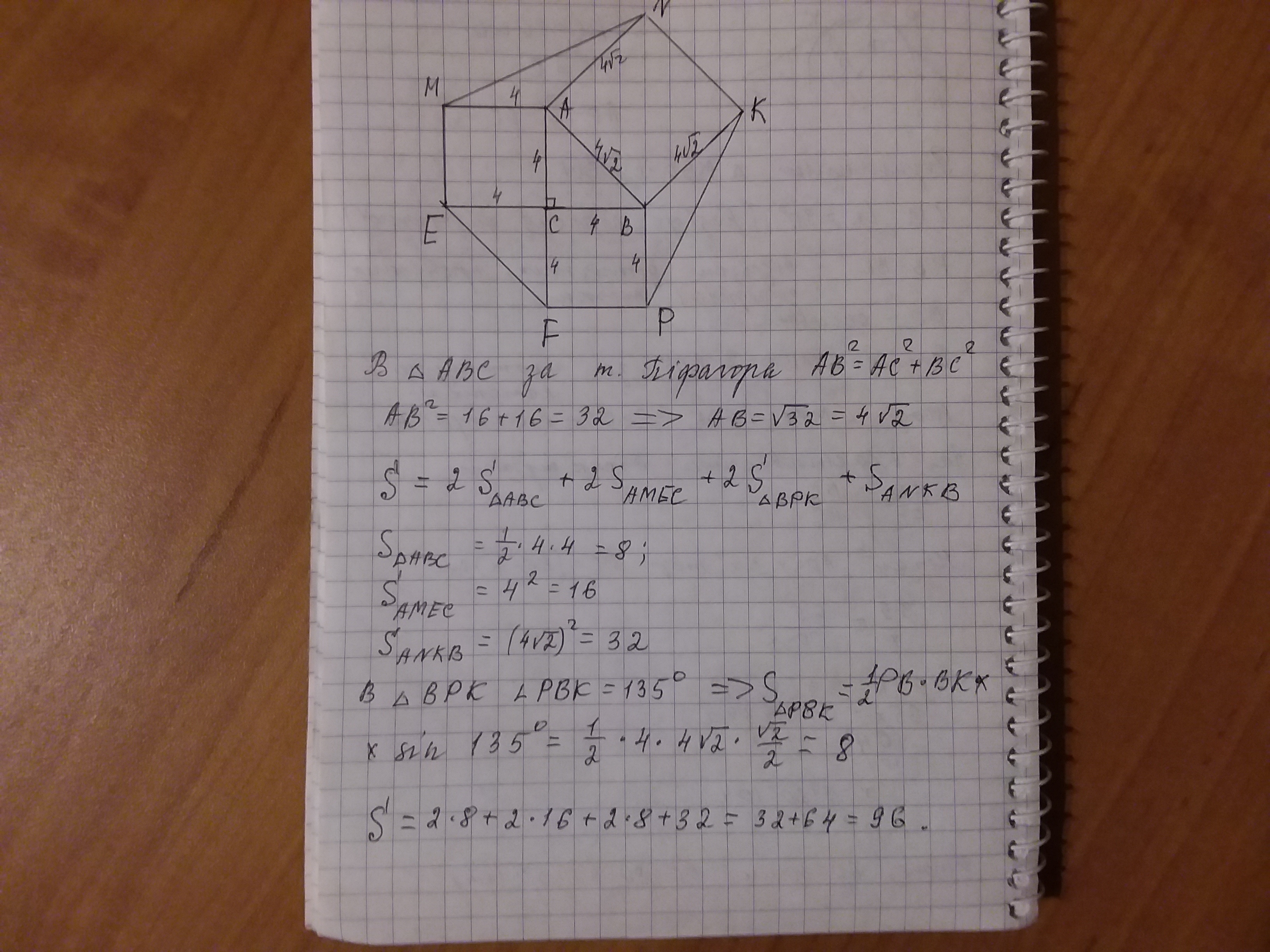 Катет рівнобедреного прямокутного трикутника дорівнює 4см. На сторонах трикутника ззовні побудовано квадрати. Їх вершини послідовно з'єднано. Знайти площу утвореного шестикутника.