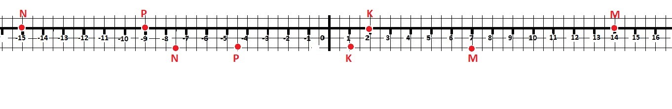 а) М правее О на 14 клеток; б) N левее О на 15 клеток; в) Р левее О на 9 клеток; г) K правее О на 2 клетки.