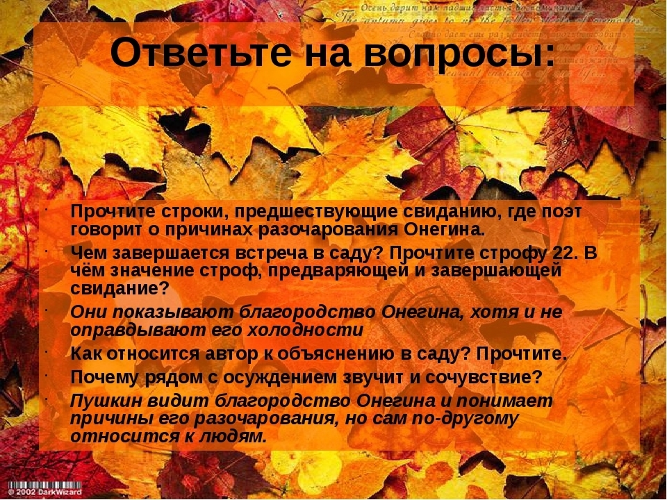 1)Евгений и Татьяна встречаются в саду. Там он читает ей исповедь, насчет того, что он будет плохим мужем, любовь пройдет между ними быстро и он начнет изменять ей, он просто не способен любить. После этой встречи Татьяна не перестает любить Онегина.