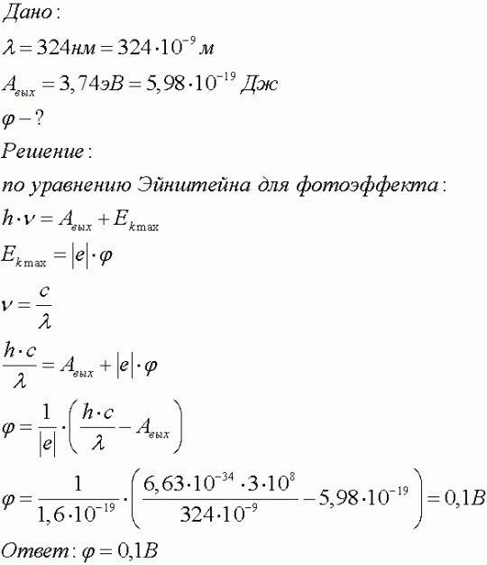 До какого минимального потенциала зарядится цинковая пластина, если она будет облучаться монохроматическим светом длиной волны 324 нм?