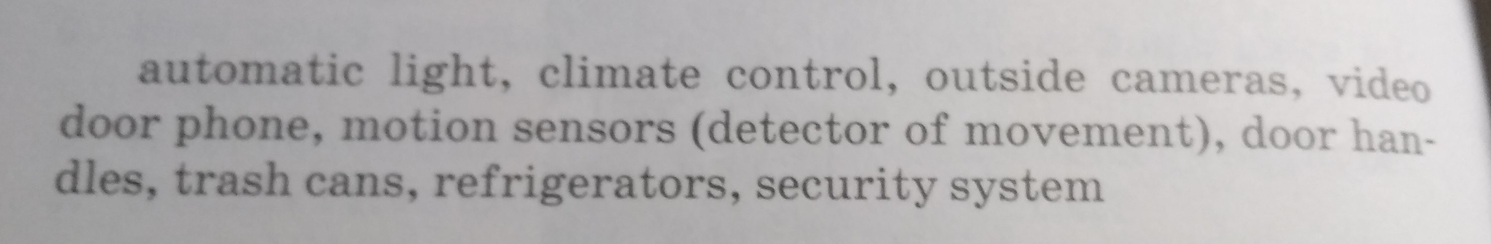 My smart home. My house has outside cameras, it is very important to see if a stranger came to my house, also my house has a video door phone so I can see who is calling me at the door. The security system is also important for your own preservation . When I enter my house, the light turns on automatically , and when I leave the room ,the light turns off automatically. In the room in winter I'm not cold, in summer not hot to me because there is climate control. In every room on the wall hangs a tablet, it is needed in order to make it easy for me to find on the Internet, what I need.