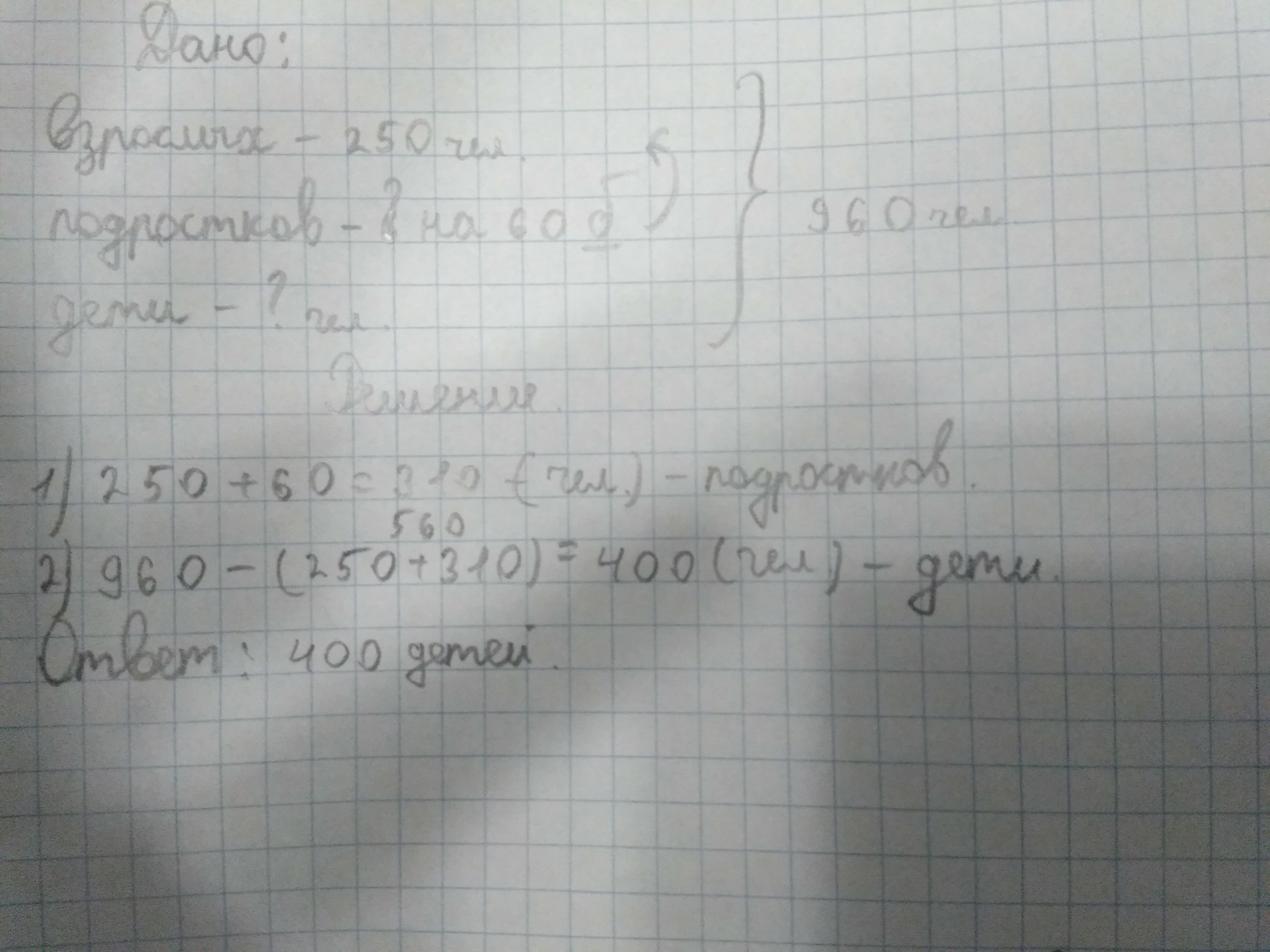 Из библиотеки на дом берут книги 960 человек. Из них 250 взрослых, подростков на 60 больше, чем взрослых, а остальные читатели дети. Сколько детей берет книги из библиотеки?? Пожалуйста с условием