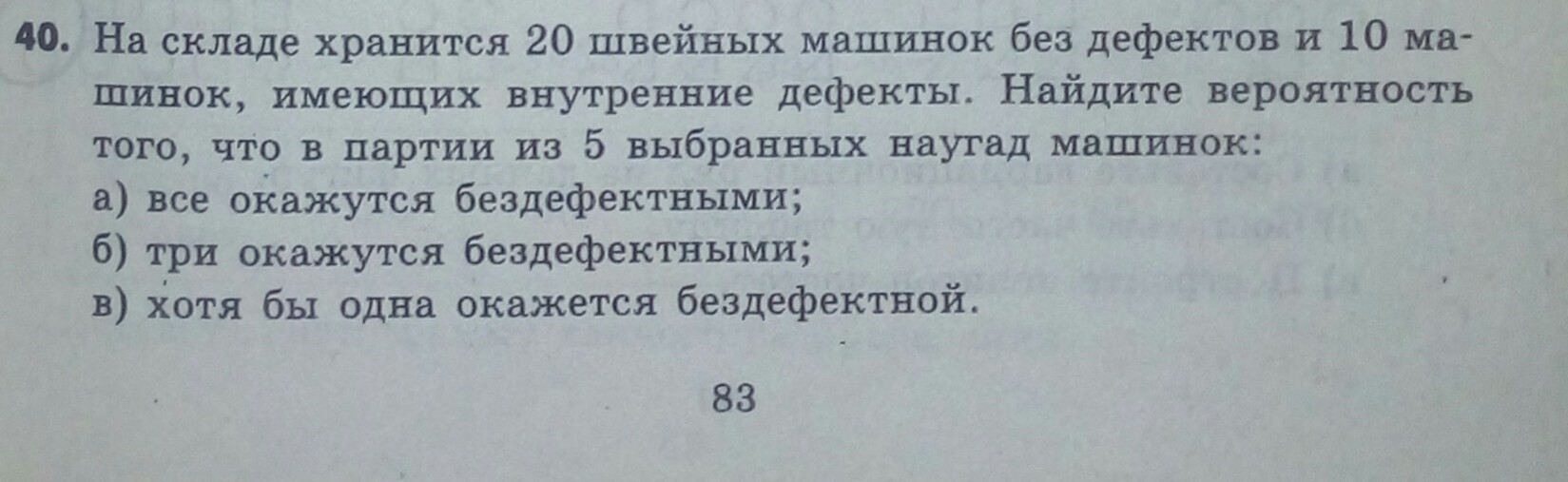 в) событие "хотя бы одна машинка без дефекта" противоположно событию " все машинки с дефектом". Вероятность считаем как вероятность противоположного события. Вычисляем вероятность того, что выбираем 5 машинок из 30, причём все 5 элементов из 10-элементного подмножества, а затем полученное число вычитаем из 1.