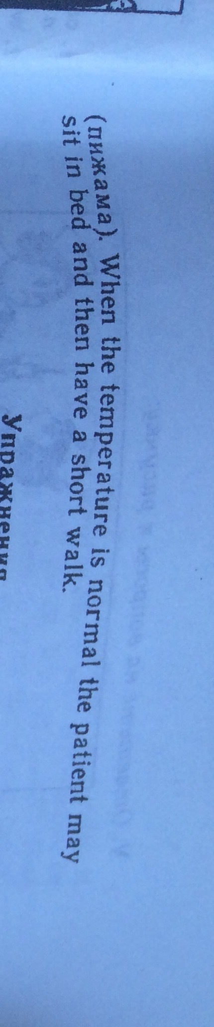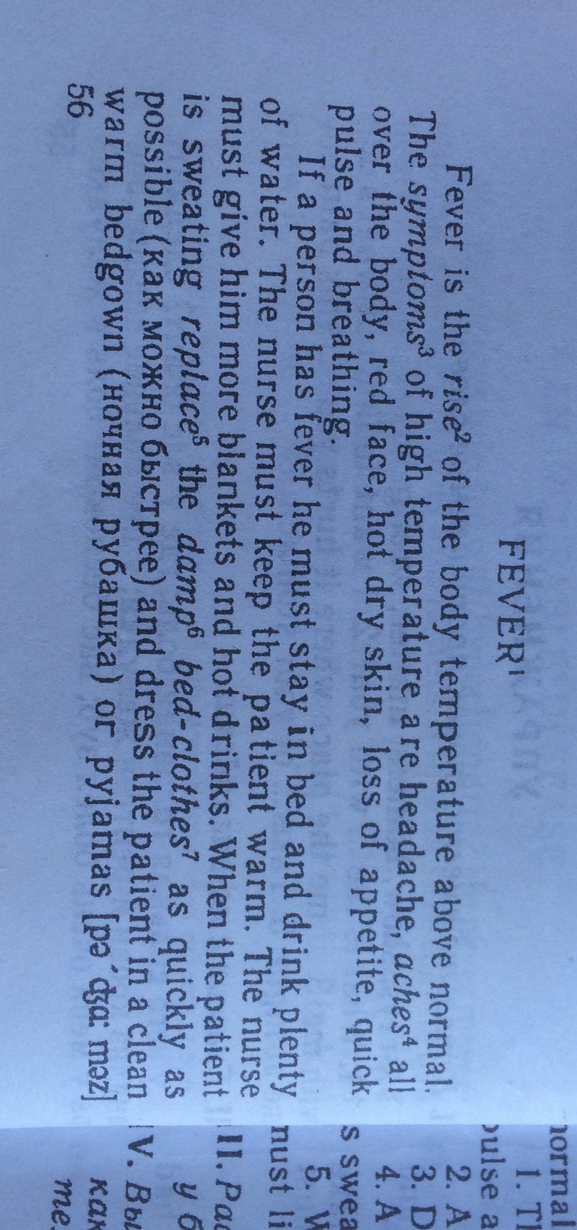 Если у человека лихорадка,то он должен оставаться лежать в кровати и пить много воды. Медсестра должна держать пациента в тепле. Она должна давать теплые одеяла и горячие напитки.Когда пациент будет потеть,стоит заменить постельное белье как можно быстрее и одеть пациента в чистую теплую ночную рубашку или пижаму. Когда температура нормализуется,пациент может посидеть на кровати,а затем отправиться на короткую прогулку.