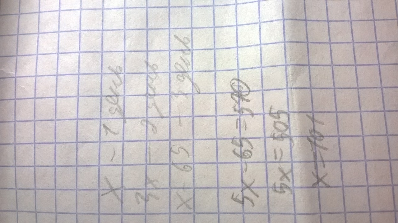 Если на 65 килограмм меньше,чем в первом дне,то так.А если на 65 кг меньше,чем во втором дне,то за x бери 2 день,тогда 1 день будет 1/3x,а 3 день всё также x-65,ну и дальше составляешь