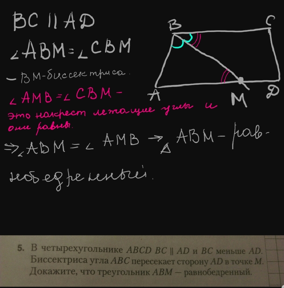 Ой,в конце: угол АВМ= углу АМВ,следовательно треугольник АВМ равнобедренный.