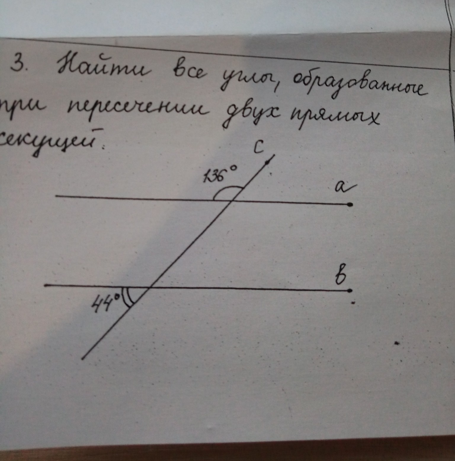 Аналогично, угол, смежный с углом в 136°, дополняет его до развёрнутого, значит, равен 180° - 136° = 44° (внешние накрест лежащие углы равны), а вертикальный с ним равен ему, т.е. 136°.