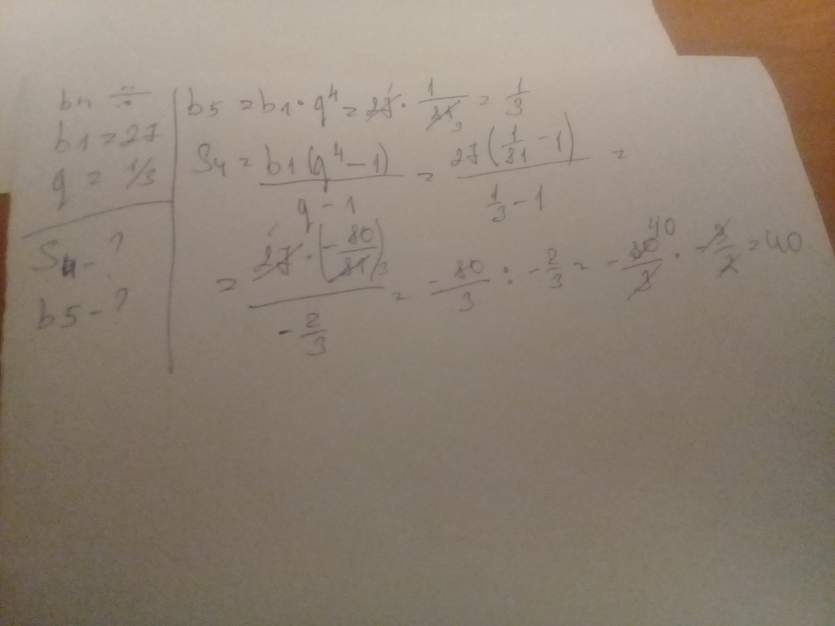 найдите пятый член и сумму четырех первых членов геометрической прогрессии, если b1=27, а знаменатель q=1/3