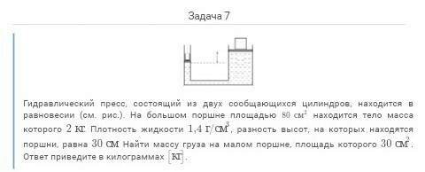 Гидравлический пресс, состоящий из двух сообщающихся цилиндров, находится в равновесии. На большом поршне S=80см² находится тело m=2кг. Плотность жидкости 1,4г/см³, разность высот, на которых находятся поршни, равна 30см. Найдите m груза на малом поршне, S которого 30см². Ответ в кг.