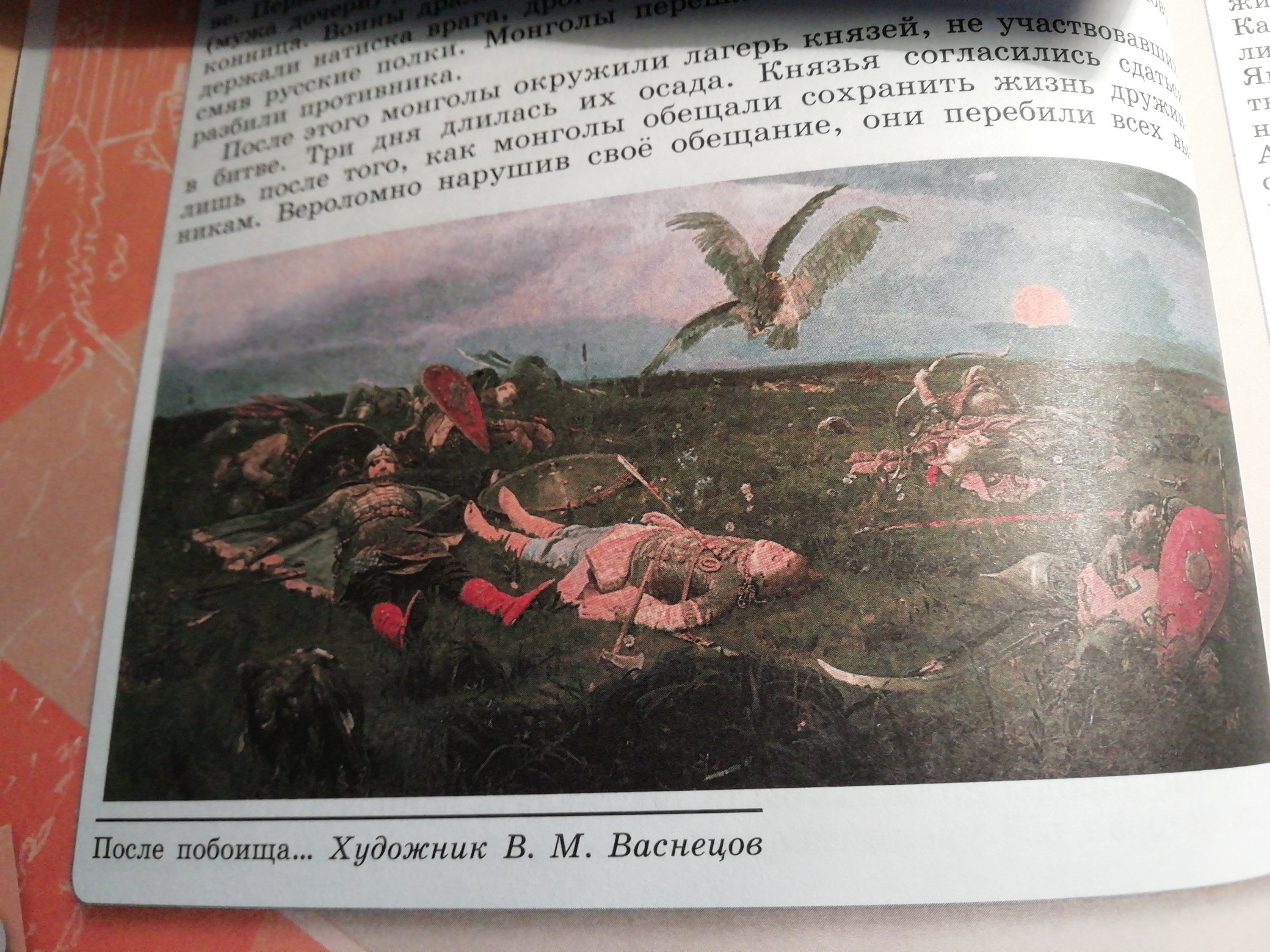Хищные птицы, парящие над телами, еще больше нагнетают обстановку. Они единственные рады тому, что произошло на этом поле. Храбрые воины погибли, а их родные еще долго будут оплакивать любимых и дорогих сердцу людей. Беспощадная битва не оставила в живых никого. Каждый человек должен знать историю своего народа, а эта картина показывает, на что были готовы наши предки, ради будущих поколений.