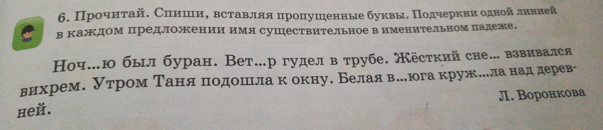 Прочитай Спиши вставляя пропущенные буквы подчеркни одной линией в каждом предложении имя существительное в именительном падеже ночью был Буран ветер гудел в трубе жестких не развивался вихрем утром Таня подошла к окну Белая вьюга окружала Над деревней