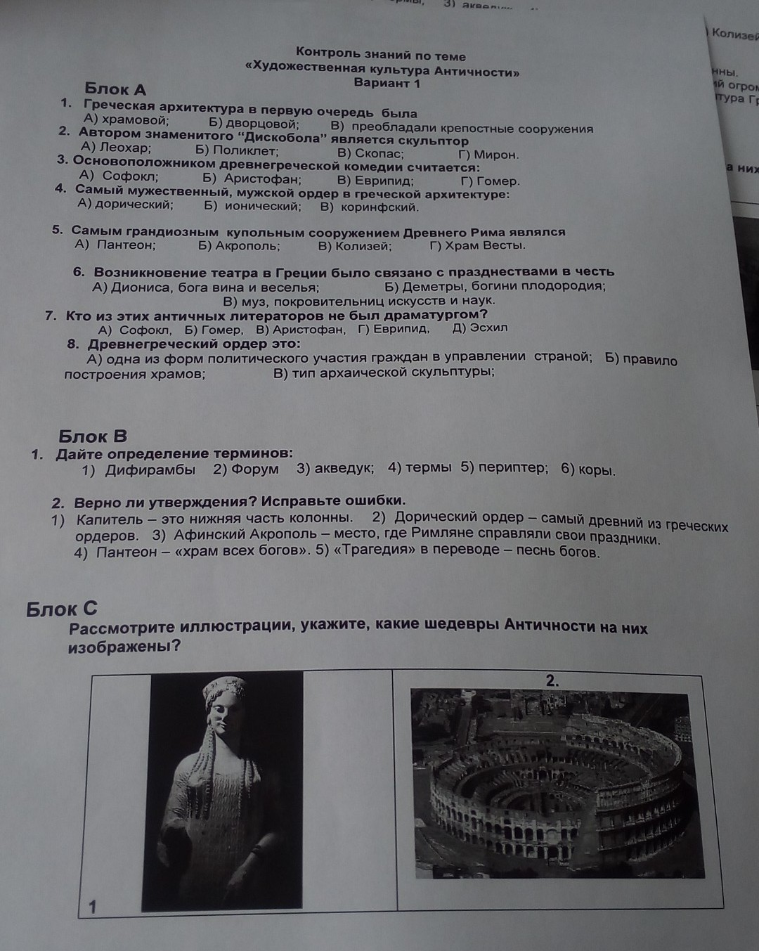 Блок А 1. Храмовой. 2. римский скульптор Мирон.3. Софокл и Еврипид. 4. Дорический (считается мужским). 5. Колизей (колоссальный). 6. Бога Диониса именно он считается родоначальником театра др.Греции. 7. Ответ В правила построения храмов сочетание несущих и несомых частей.