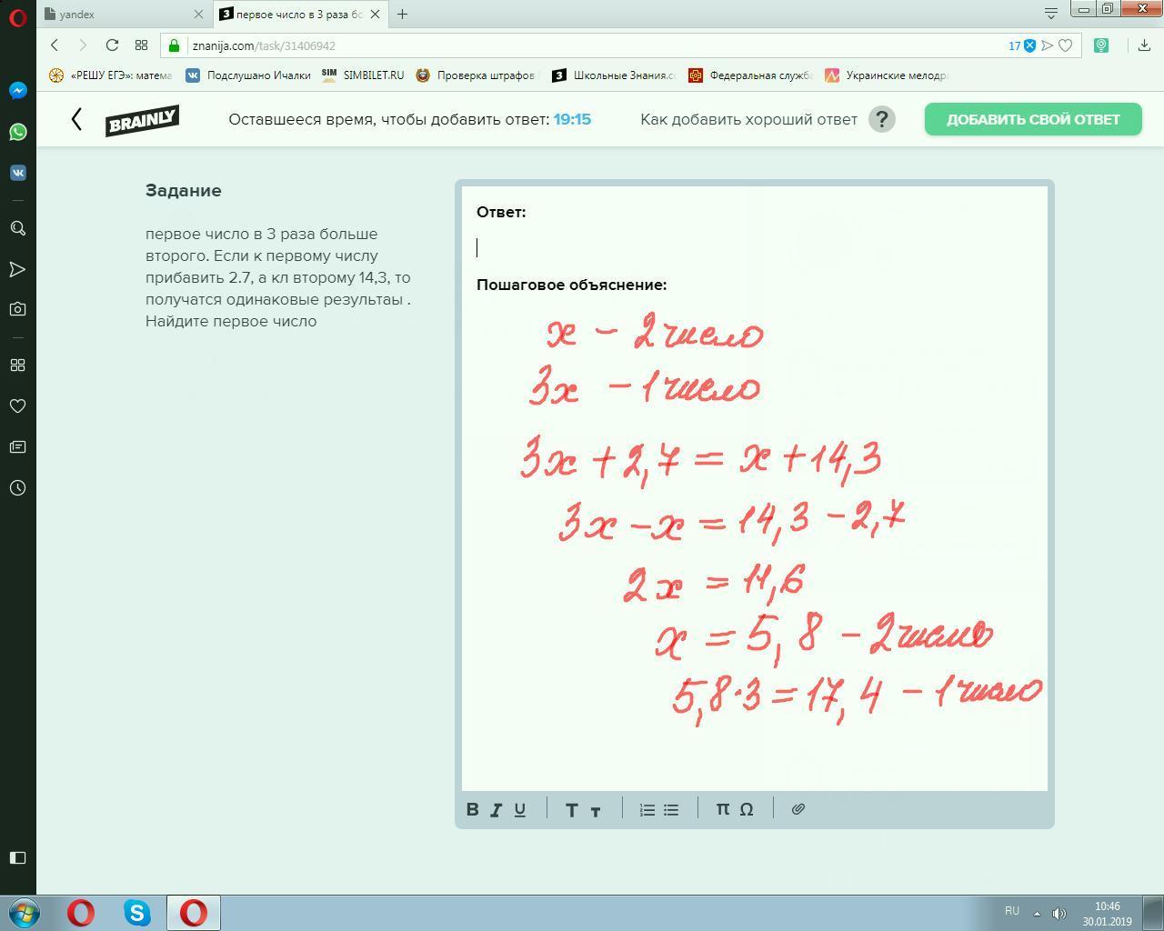 первое число в 3 раза больше второгo. Если к первому числу прибавить 2.7, а кл второму 14,3, то получатся одинаковые результаы . Найдите первое число