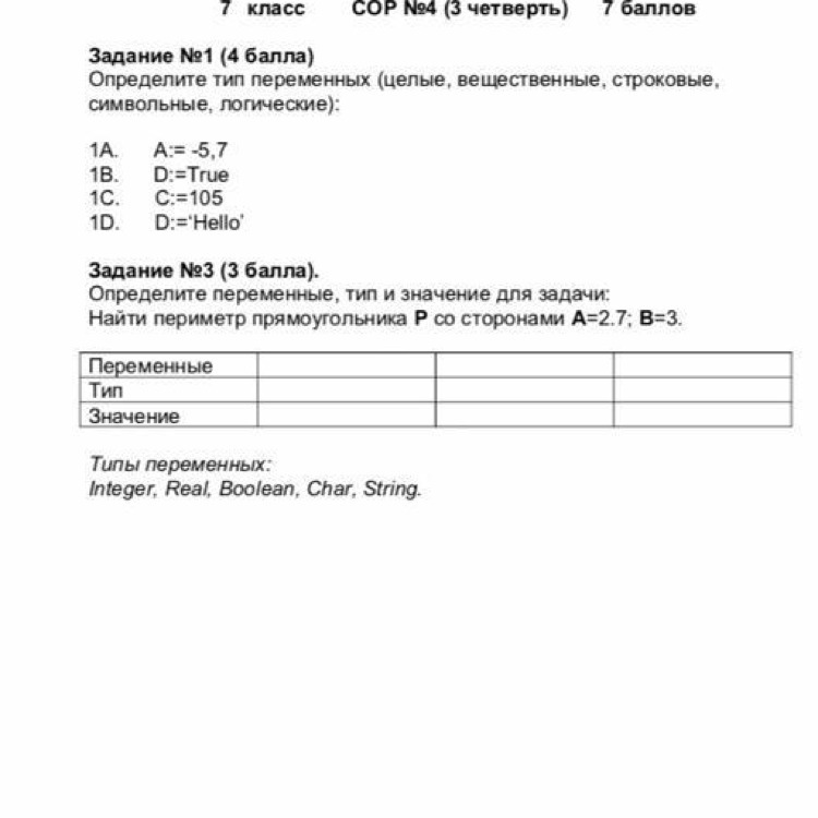 Определите тип переменных (целые, вещественные, строковые, символьные, логические) и ещё задание номер 3, спасибо заранее