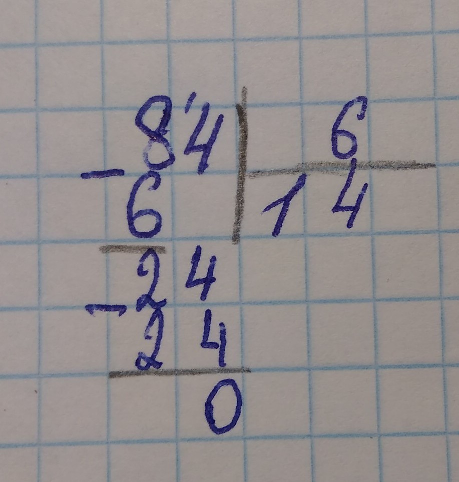 Каждую единицу умножаем на 6, что получаем, то отнимаем от 84, что осталось от 84 сносим вниз и решаем дальше