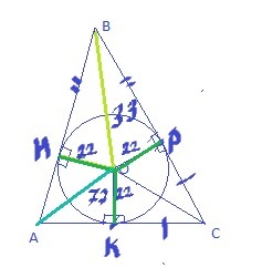 Радиус окружности, вписанной в треугольник ABC, равен 22 см. Расстояние от центра О этой окружности до вершин A и B равны OA=77см, OB=33см. Найти расстояние OC.
