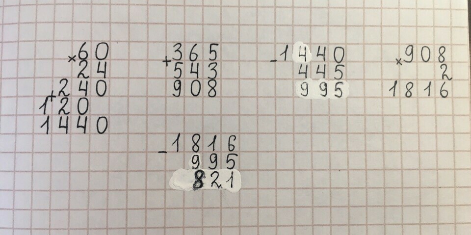 Сколько минут в двадцати четырёх часах: 60 минут умножить на 24 часа будет 1440 минут.